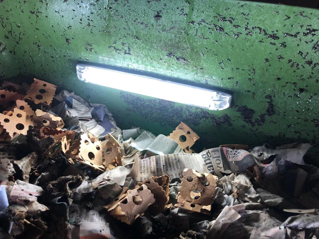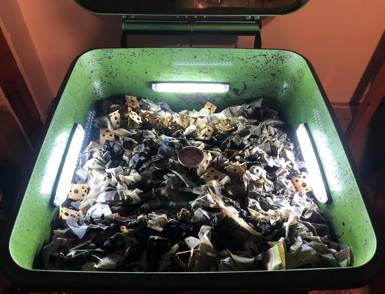 I've had the Hungry Bin for just over 100 days. Just about every time I went to add food, I had to save worms from being crushed by the lid, or from escaping altogether. As the worm population grew, so did the amount of time that went into rescuing the little guys.Knowing that worms generally try to avoid light, I first tried putting in some LED light pucks protected by ziplock bags. The light pucks weren't really a practical long-term solution (needed to switch out / recharge batteries often), but they worked as a proof of concept; the LED lights did deter some of the worms from coming out.Having seen good results with the pucks, I decided to go all in using a set of inexpensive waterproof LED Utility Strips that ran off of 12 volts DC. I wanted to share my hack because it definitely has helped reduce the number of worms. After installing all three light strips, I'm not seeing any worms try to escape!Parts:- Partsam 18 LED Utility Strip -- I started with one LED strip, then added two more after seeing that some worms were still crawling around the walls with just the one strip.- 12V wall adapter, rated for 0.5A that came from an old Cisco router- Mechanical screws, bolts- Small length of electrical wire- Few tools for getting things in place - drill, soldering iron to join the wiresInstallation:1. Measured the amount of power drawn from a single LED strip. That came out to 0.12 Amps / 1.4 Watts.2. The LED strips have a bare set of wires that come out of the back, in the center. I drilled a small hole in the wall of the bin so the wires could come out.3. Each strip also has a pair of holes on either end so you can attach the lights. I drilled a pair of holes for these as well and used mechanical screws and bolts to fix them to the wall.4. Cut / stripped the wire for the adapter. Soldered the lights in parallel so they each received 12V.5. Plugged the adapter in, and am happy to confirm I've yet to see any any worms surface.Am I happy with the results?- Totally. The LED strips don't draw much charge, barely put out any heat, have a nice rubber gasket on the back that helps make the lights waterproof, and finally, installation wasn't too bad.- The lights have a clean look, and actually help me see corners of the bin when I'm burying food / checking up on the little guys.- The wiring around the bin is actually pretty minimal. I thought the whole thing would have a bigger footprint, but I think I'll be able to make things look pretty tidy.- Finally, I think the lights look great. They have a nice, clean look, and the light they give off has just the right amount of brightness and is a nice color, too.Update: Wanted to note that since installing the lights, I�m thinking it might be a good idea to put them closer to the top so that the bin can fill all the way up.